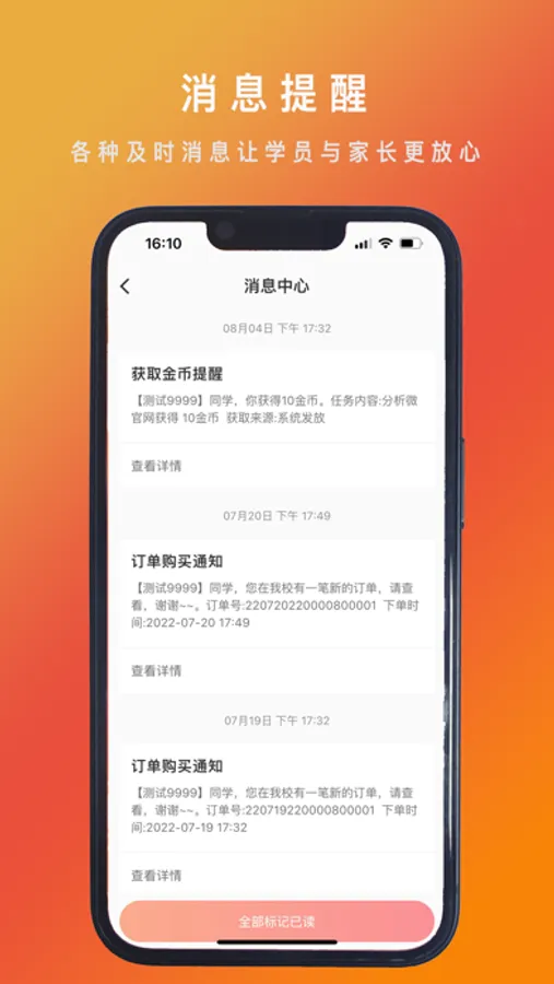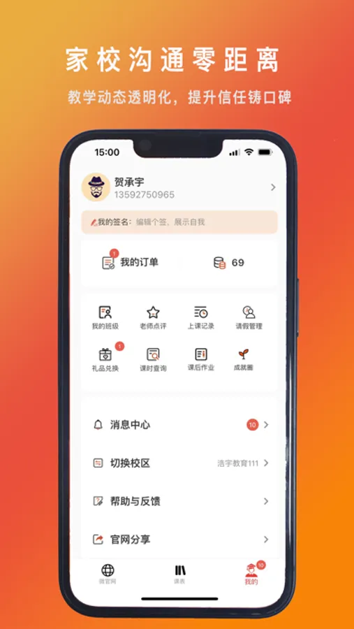 学员与培训机构家样沟通工具,学员可在APP上查询购买订单,剩余课时,上课灵记录,剩余课消,请假,提交课后作业,评价作课老师,兑换礼品,接收各种消息等