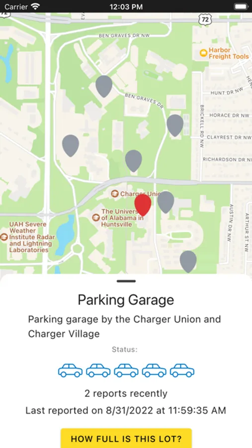 ParkSight is an app for UAH that allows users to check up on the status of lots around campus. Help everyone by using this crowdsourced app to share information about parking around campus.