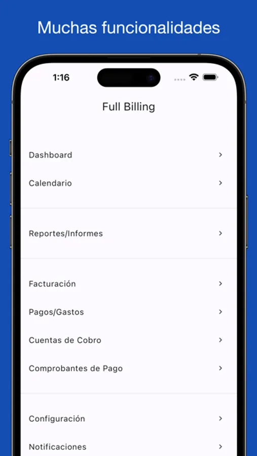 Además de estas funcionalidades, Full Billing te brinda una experiencia intuitiva y fácil de usar. Podrás generar informes detallados y disfrutar de otras características que te ayudarán a optimizar tus procesos.