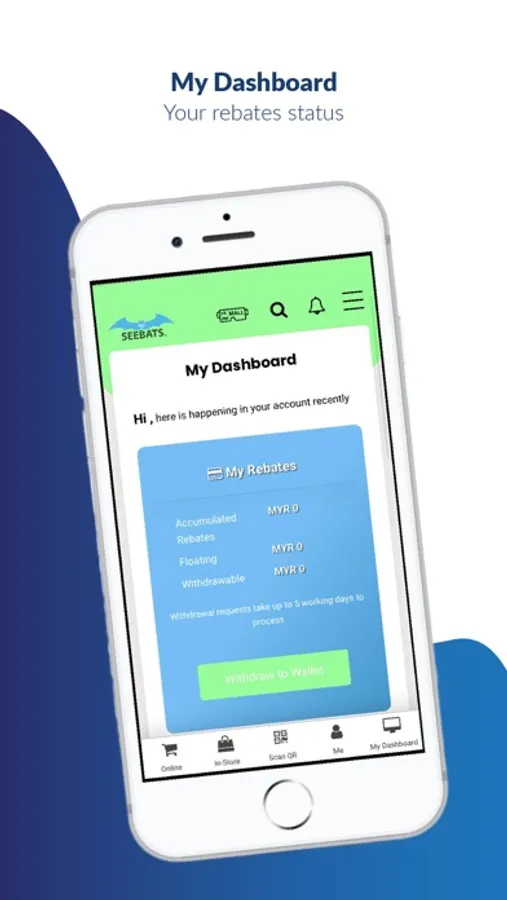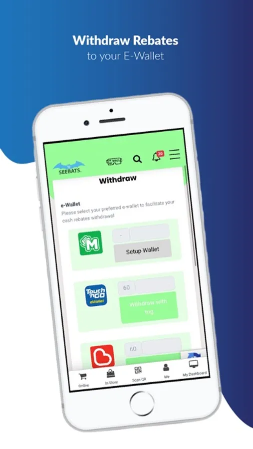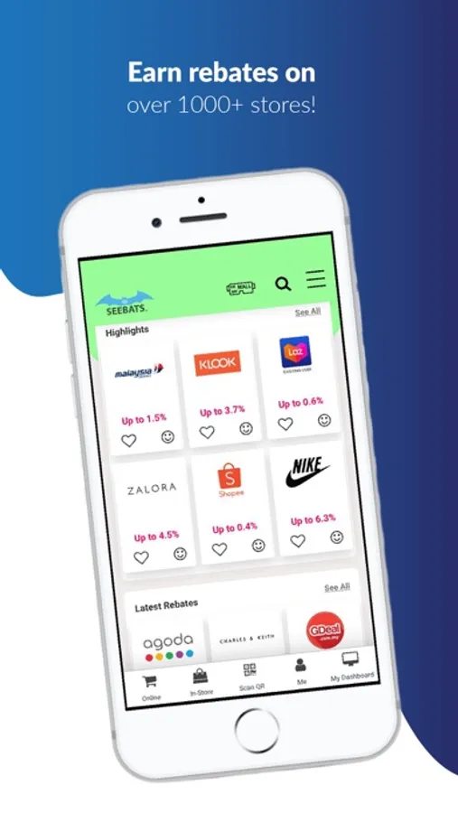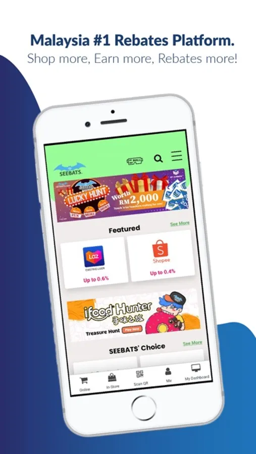 SEEBATS is a rebate platform for its members to gain instant cash rebates while shopping online and offline. Every time a transaction is made via SEEBATS, the shopper gets a percentage of the spent amount back as rebate. These rebates earned can be withdrawn as cash through registered e-Wallets.