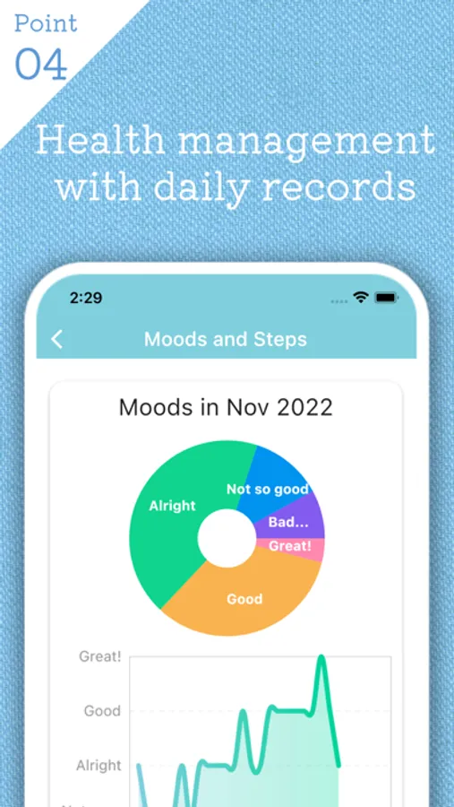 You can look back on your mood and steps recorded every day. Check yourself and your family's health.