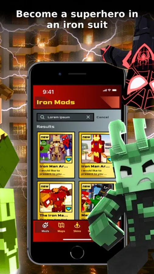 Iron Mods Addons for Minecraft an application with Superheroes addons to diversify your game. Together you will be able to try your hand at the role of different superheroes, test their strength and fight against a wide variety of opponents.