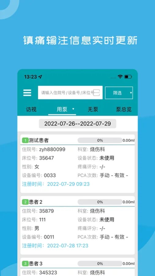 疼痛管理系统移动端,主要功能包括 “患者列表”“病区列表”“镇痛访视”“患者镇痛管理”“输注设备管理”等。