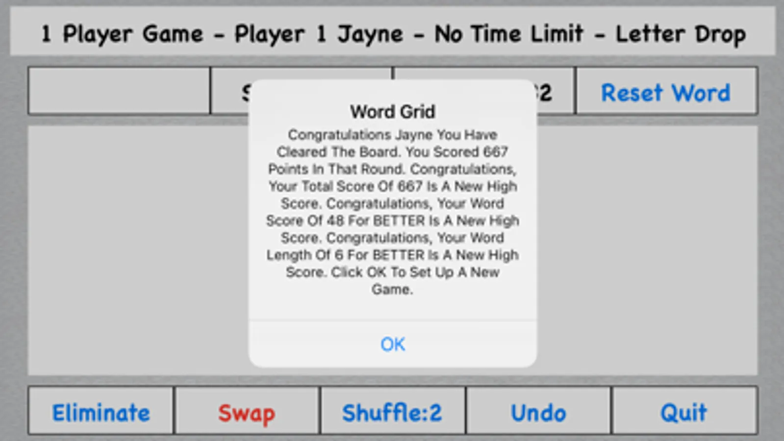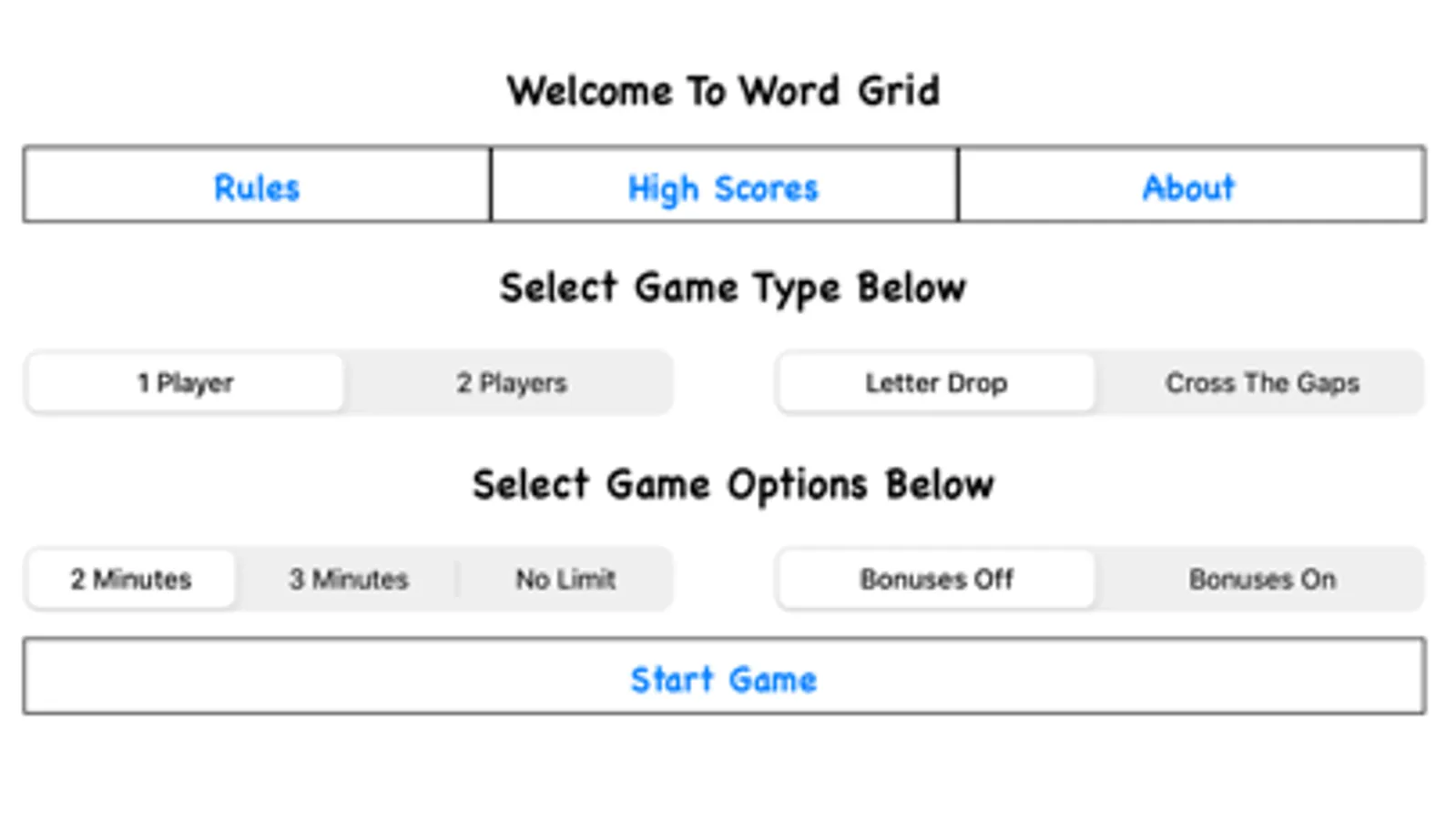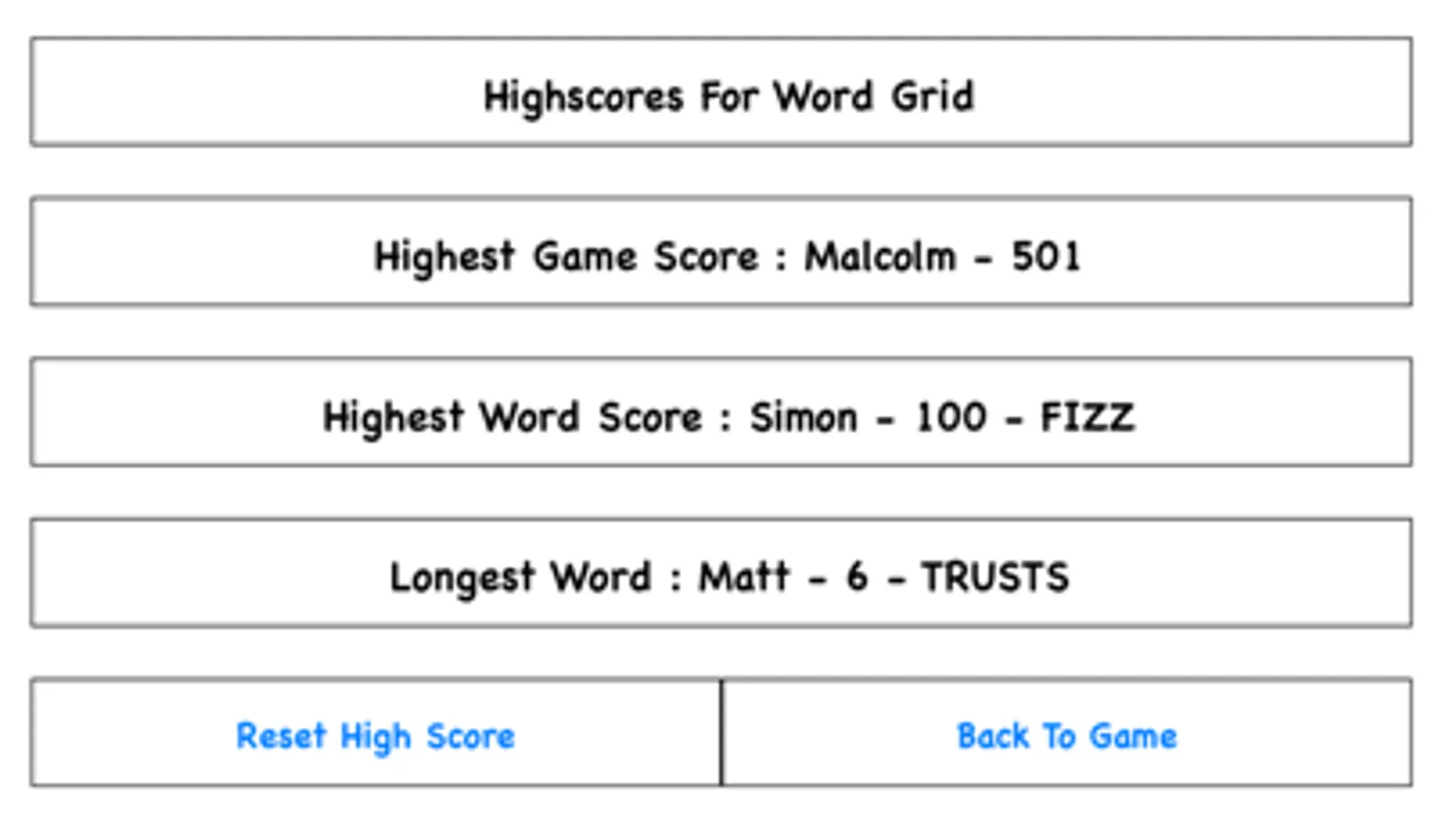The aim of the game is to clear a 5 row by 15 column grid containing letters, by creating English language words using the letters available. A word must contain at least 3 letters, and you can only select each letter once. The distribution of letters in the grid will be random and in line with the frequency of letters used in the English language.