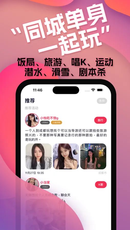 》饭局、旅游、唱K,要么一起去运动,潜水,滑雪,又或者玩游戏、剧本杀、狼人杀等等,你可以在这里找到一个合适人。