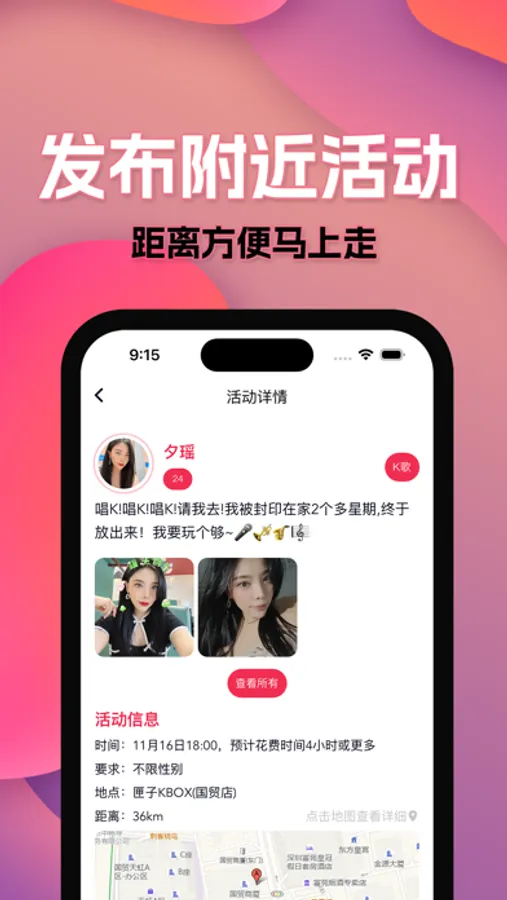 发布活动:邀请有趣的人,立即发布户外活动、排队饭局、单身交友等各种活动。