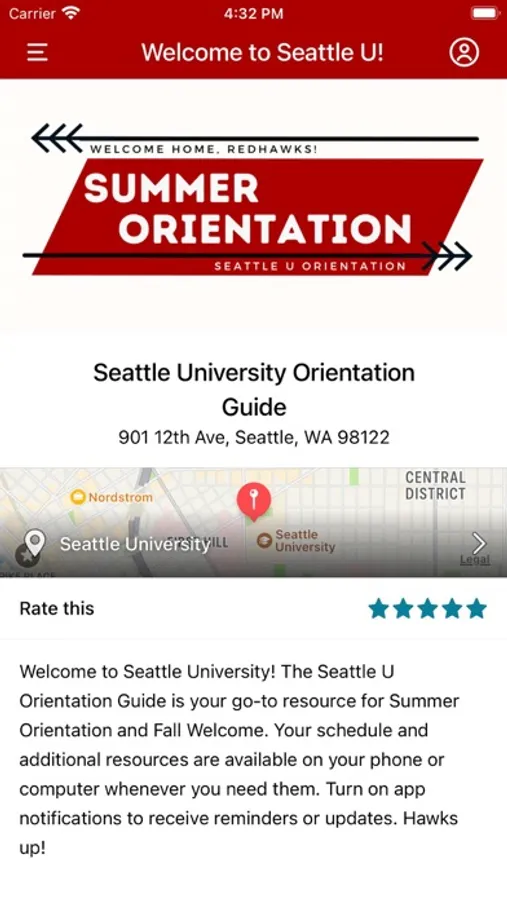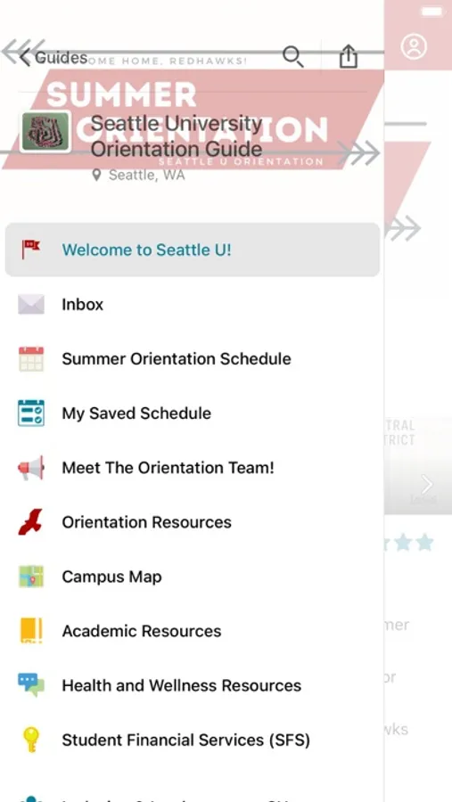 Welcome to Seattle University! The SeattleU Orientation app is a guide for New Student Orientation. As you begin your journey to becoming a Redhawk, Orientation Programs and the entire SU community will be here to support you along each step of the way. This guide will be your go-to resource for your orientation schedule, accessing sessions, a campus map, transition resources, frequently asked questions, and so much more. Hawks up!