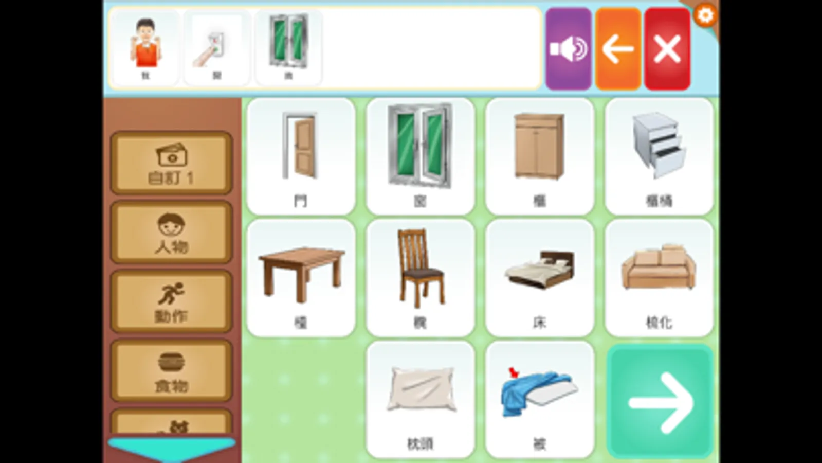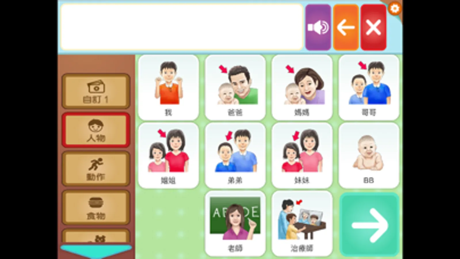 Automatic voice output function or “Speak” button: select a single picture or multiple pictures from different categories to form meaningful sentences