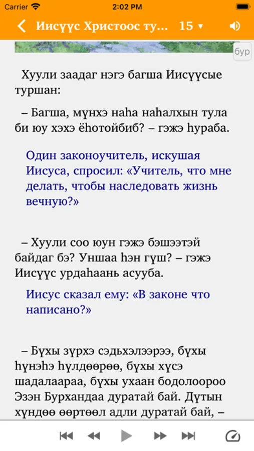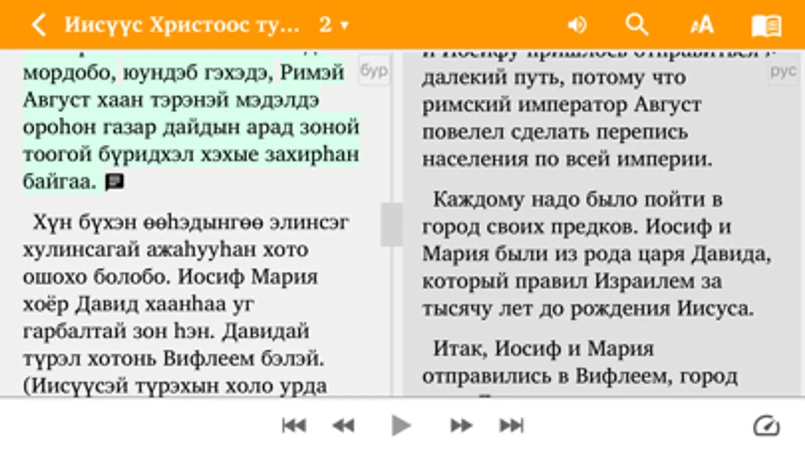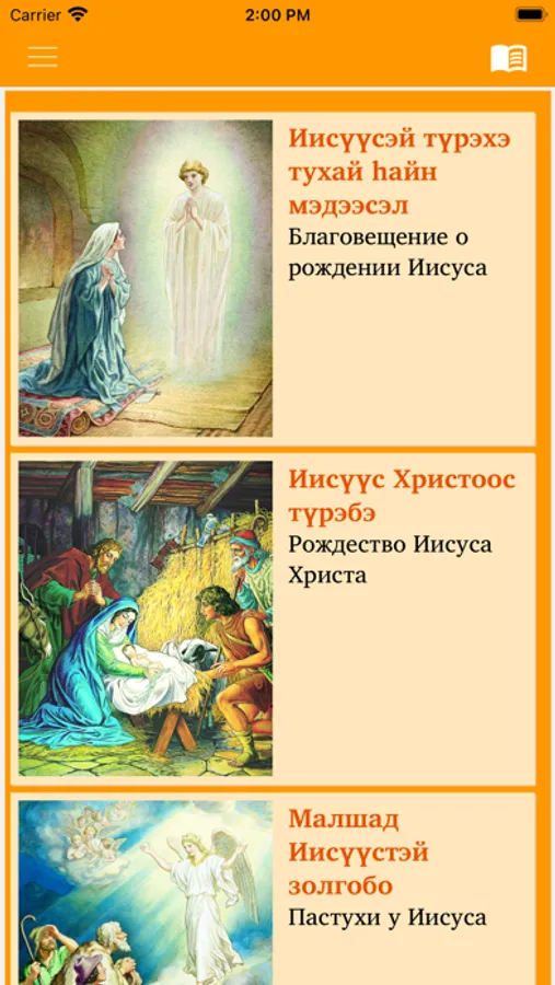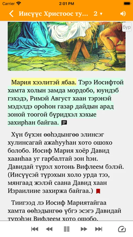 An app of Illustrated Stories about Jesus in the Buryat language for children and adults. Includes audio that has been synchronized with the Buryat text (an Internet connection is needed for the first download of each audio file to the smartphone's internal memory, with subsequent offline listening).