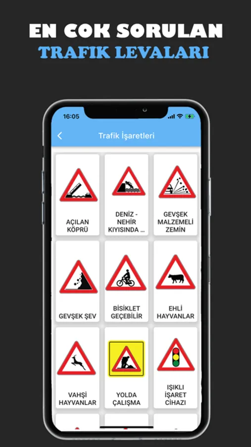 Ehliyet sınav soruları uygulamasında bulunan trafik işaretleri sayfasından bilmediğiniz tüm trafik levhalarını bulabilir ve anlamlarına çalışabilirsiniz. Ehliyet sınavında genellikle 2-3 adet trafik işareti / levhası sorusu gelmektedir.