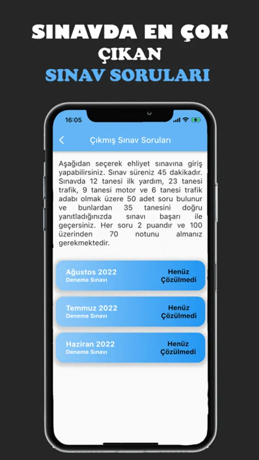 Ehliyet Çıkmış sınav soruları çözme sistemi sayesinde daha önceki yıllarda ve aylarda çıkmış soruları ister tek tek isterseniz gerçekten sınavdaymışşınız gibi çözebilir ve kendinizi test edebilirsiniz. Sınavdan 70 üstünde almanız gerektiğini unutmayın.