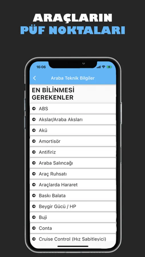 Ehliyet Sınavını kazandıktan sonra gireceğiniz pratik sınavında sınav sorumlusu size arabanın bazı bölgeleri ile alakalı sorular soracaktır veya sizden arabayı tanıtmanızı isteyecektir. Uygulama içerisinde arabanın kritik öneme sahip parçaları ve sistemleri hakkında bilgi sahibi olabilir ve sınav esnasında sınav sorumlunuza bunu söyleyebilirsiniz. Böylelikle sınavdan geçme sansınız daha da artacaktır.