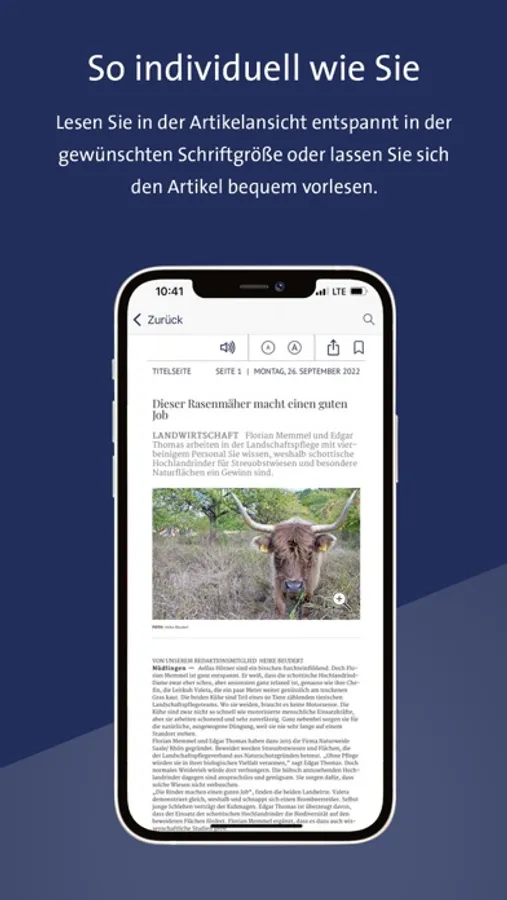Lesen Sie das E-Paper in der für Sie geeigneten Größe: Dank der Zoomfunktion navigieren Sie intuitiv durch Ihre Tageszeitung. In der Artikelansicht können Sie zusätzlich die Schriftgröße individuell anpassen.