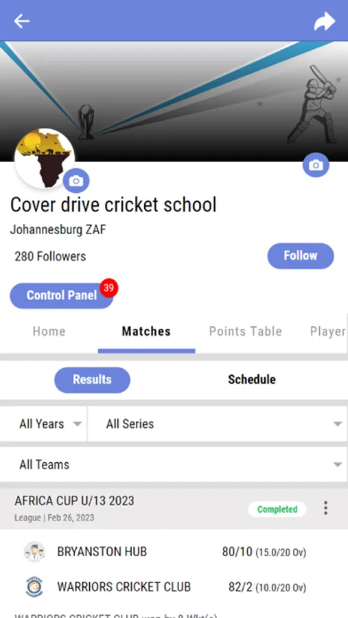 Follow along with cricket score updates of CoverDrive Cricket School by downloading the app.