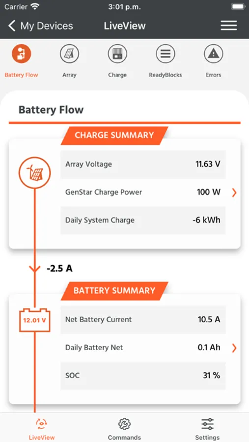 Connect to your Morningstar GenStar DC System Controller via Bluetooth to view real-time operating information and product configuration details. A dashboard displays all pertinent information about your system and a settings page details the product settings.