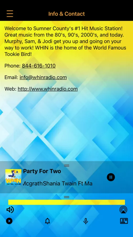 Welcome to Sumner County's #1 Hit Music Station! Great music from the 80's, 90's, 2000's, and today. Murphy, Sam, & Jodi get you up and going on your way to work! Plus, listen for your chance to win concert tickets, movies passes and lots of great prizes! WHIN is the home of the World Famous Tookie Bird!