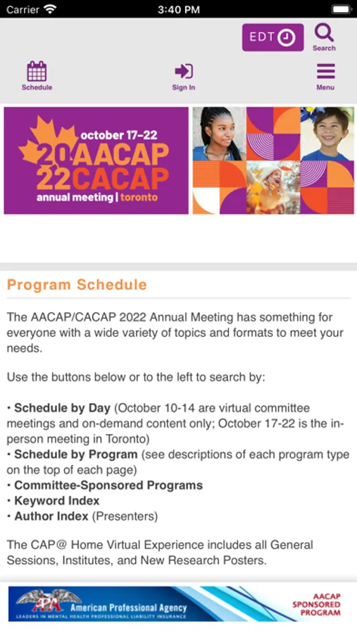 The AACAP / CACAP 2022 Annual Meeting will be held October 17 - 22 in Toronto, Ontario, and virtually. Login to view Sessions and Papers saved as favorites. View schedules, locations, floor plans, and people. Attendees will now be able to facilitate their experience at the meeting using the mobile app.