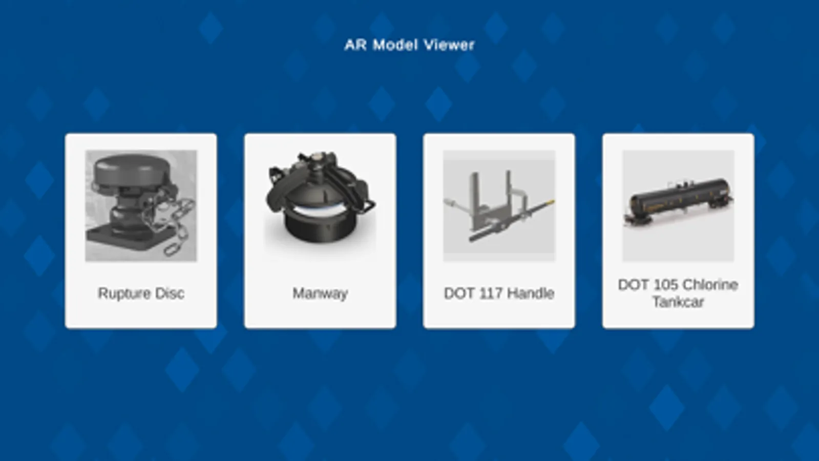 TRANSCAER Augmented Reality Model Viewer Application is used in hazardous material emergency response educational training. Rupture disc device, protective housing, DOT 117 handle and DOT 105 chlorine tank car can be viewed in augmented reality scene with additional informations.
