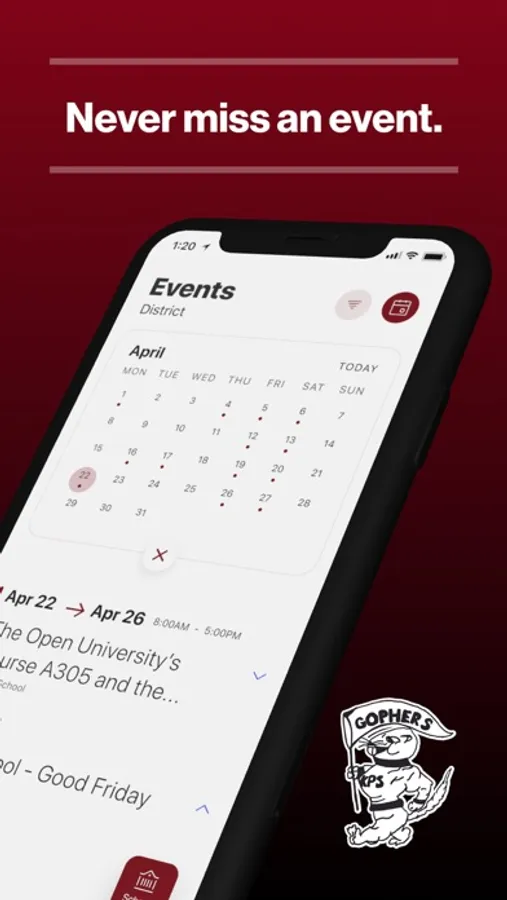 The event section shows a list of events throughout the district. Users can add an event to their calendar to share the event with friends and family with one tap.