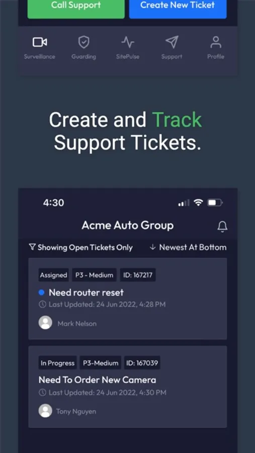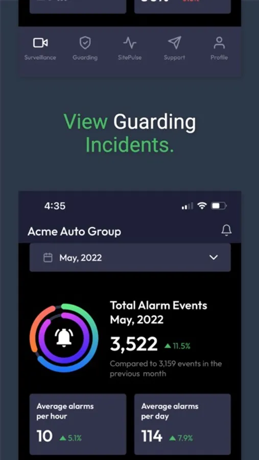 The EyeQ Monitoring mobile application provides key functionality and metrics for the clients of EyeQ Monitoring’s suite of services. Via this flexible and easy-to-use application, clients can examine live and recorded video footage from their security cameras. The application also provides key metrics for our Virtual Guard clients, including alarm statistics, response times, and incident details. Those clients with access to our SitePulse™ product can access real-time and historical device metrics.