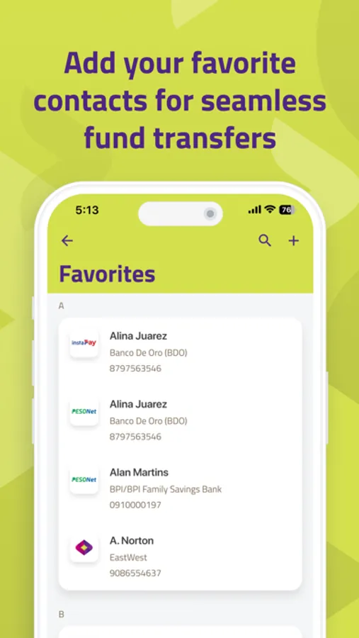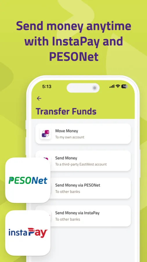 • Transfer funds to third-party EastWest account and to other local banks via InstaPay or PESONet