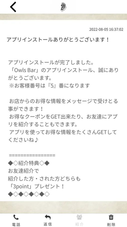 Owls BarのアプリをSNSを通じてお友達に紹介する事ができます。