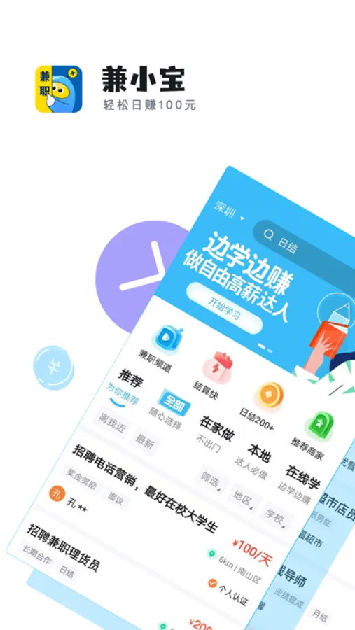 兼小宝,专注为用户提供安全、靠谱、丰富的兼职服务。覆盖全国各地,岗位信息重重审核,确保岗位真实、优质,有效。工资高、离家近、稳定、福利待遇好的工作应有尽有,用算法精准匹配雇佣双方,不断提高就职匹配概率。
