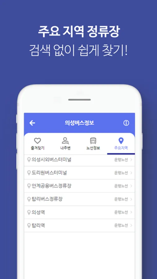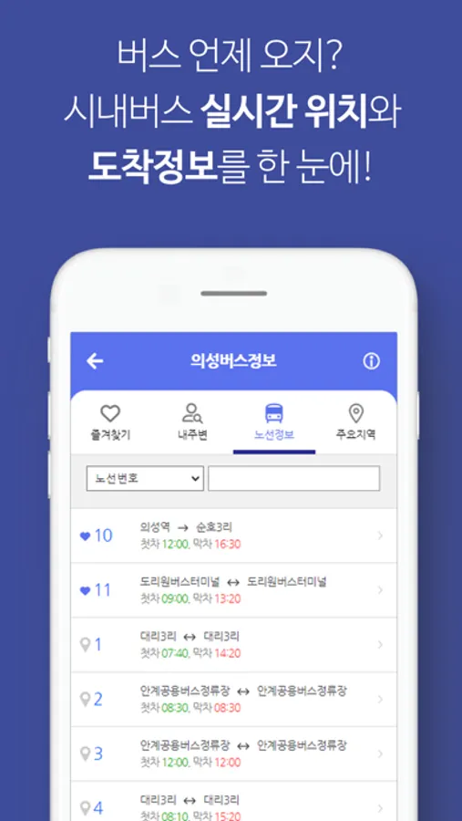 노선 번호 조회 기능으로 기본 페이지에 보여지고 있는 순환버스외 각 지역별 버스에 대한 조회가능
