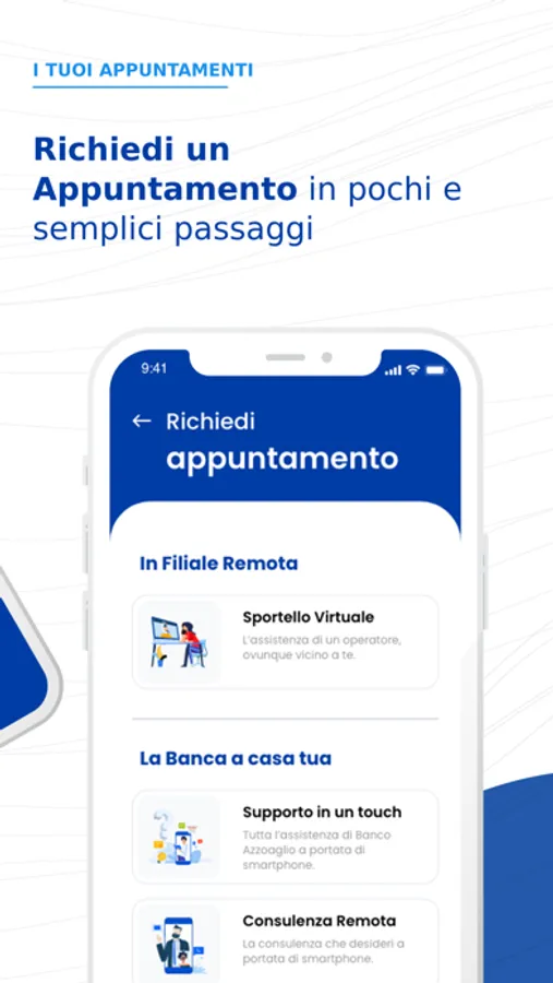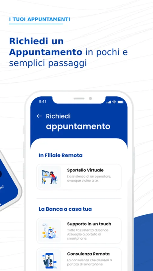 Vivi il BANCO AZZOAGLIO a 360 gradi. Prenota una consulenza in filiale (presso i nostri nuovi sportelli remoti) oppure comodamente dal tuo divano. Le nostre persone saranno disponibili ad ascoltare le tue richieste.
