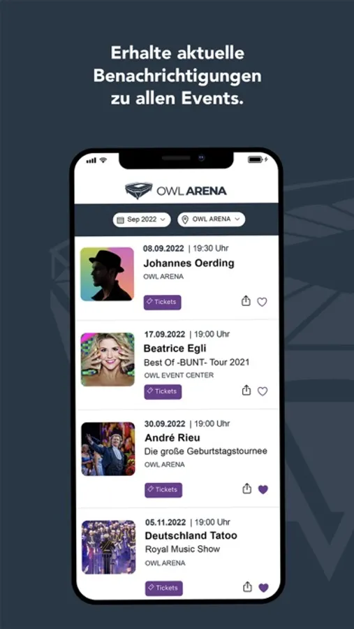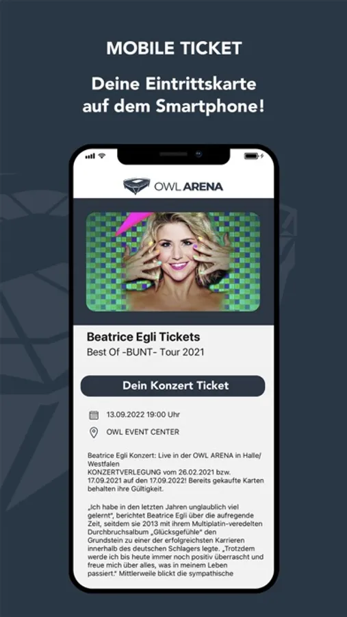Sichert euch jederzeit und von überall schnell und einfach die Tickets für Eure Lieblingsevents in der OWL ARENA oder im OWL EVENT CENTER. Ob Konzert, Show oder Sportveranstaltung - mit der App könnt Ihr Events favorisieren, filtern und Eure Tickets verwalten. Außerdem gibt es alle aktuellen Veranstaltungsnews auf einen Blick. Ihr wollt wissen, wie Ihr am schnellsten mit dem ÖPNV anreisen könnt oder ob es ein gastronomisches Angebot vor Ort gibt? Auch unsere FAQ oder Informationen zur Barrierefreiheit findet Ihr hier.