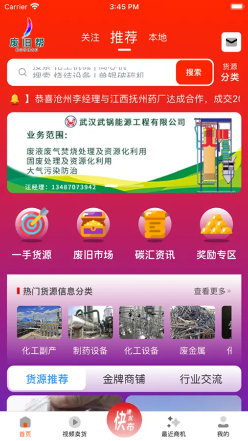 废旧帮是坤茂信息旗下app,汇集废旧市场、金牌商铺、一手货源、视频卖货、最近商机、行业交流、碳汇资讯等为广大工矿企业与回收商客户量身定做的功能,让二手物资、固废危废业务能随时随地的买货卖货。