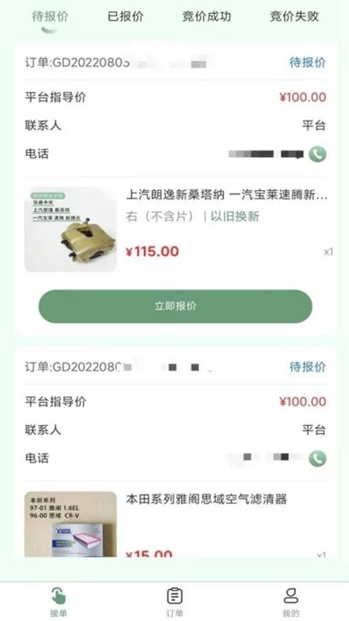 顾客在鲶鱼汽配app购买产品后,平台把购物信息推送给顾客位置方圆五公里内的汽车修理厂,汽修厂接到后选择竞价接单,向顾客进行本次更换维修内容的工时费报价,顾客根据报价排序选择其中一家汽修厂后,平台商户向被选汽修厂发货,货到后通知车主到店维修。帮助汽修厂引流获客增加收益。