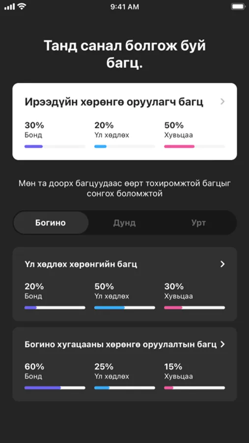 Таны санхүүгийн төлөвлөгөө, нас, эрсдэл даах чадвар, хэр удаан хугацаанд хөрөнгө оруулалт хийх сонирхолтой байгаа дээр үндэслэн танд тохирсон багцыг санал болгодог.
