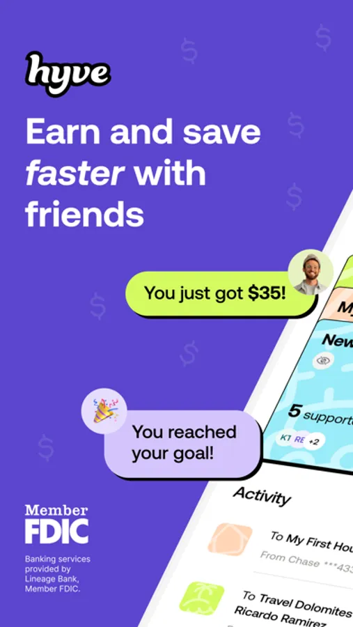 Whether you're a college student paying off activity dues, or a first-time home buyer, hyve is the money app that gives everyone the ability to get and give support towards others’ financial goals, through auto-roundups on the purchases you already make every day.