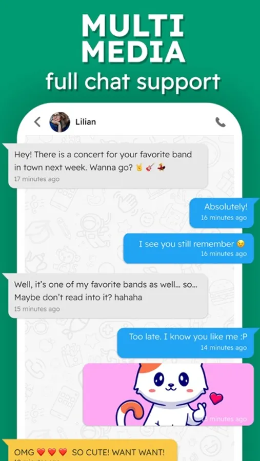 - Fully Featured Chat: We also believe that it should be up to you whether to stay on the app or not. Ringo's chat supports sending media, sound notes, and even voice calls. You will never have to leave the app or share your contact information with anyone - unless you want to of course