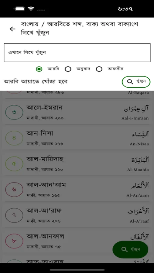 1. Searching surah by typing surah name or serial number in English and Bengali.