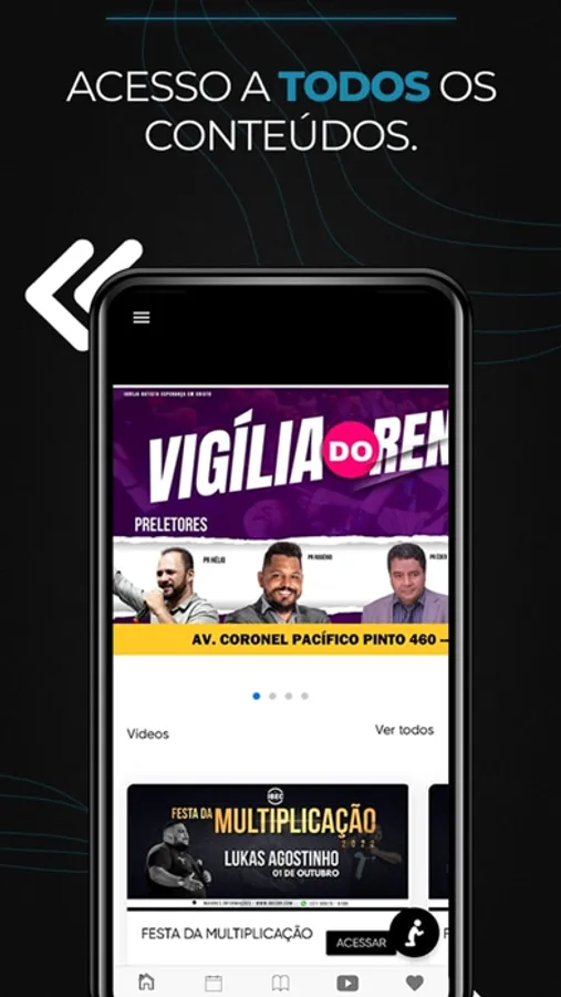 - Vídeos (milagres, palavras, louvores, pregações, matérias e divulgação de eventos);