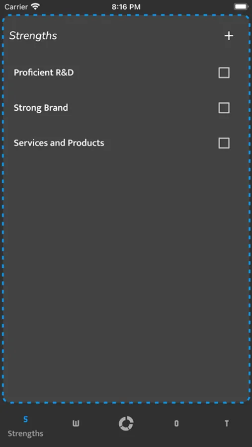 The SWOT app is an easy-to-use mobile personal development tool. All personal and professional development begins with a SWOT analysis. By evaluating your own strengths, weaknesses, opportunities, and threats one can put together an actionable plan for development. Your plan looks to capitalize on your strengths and minimize and/or eliminate your weaknesses. At the same time, a good plan for development takes advantage of the opportunities and plans to take care of potential threats.