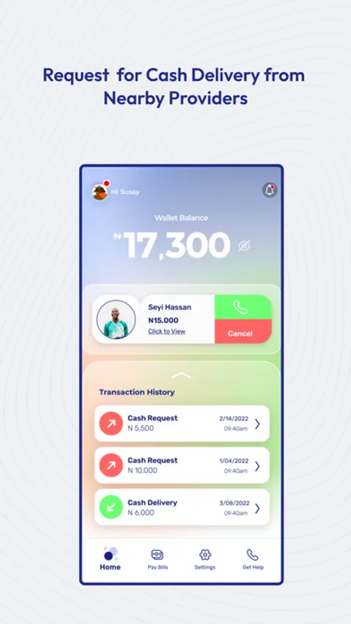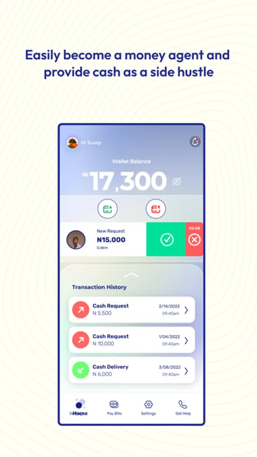 - Cash Request: Users can request fro cash to be delivered to their desired location at the same local rate obtainable for normal agency banking withdrawal. Requests are automatically paired with providers around the user's location for the delivery to be done