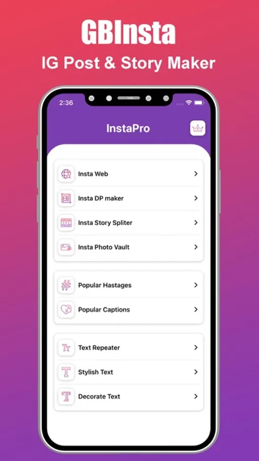 GBInsta : Story Post DP Maker app included multiple tools like Instagram web, No crop DP for Instagram account, Story splitter for Instagram, Best Hashtags to increase IG followers, Caption for Instagram, Stylish text for Instagram Profile.