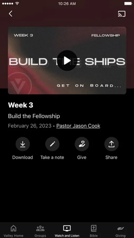This app will help you stay connected with the day-to-day life of Valley Church. With this app you can: watch or listen to past messages; stay up to date with push notifications; share your favorite messages via Twitter, Facebook, or email; and download messages for offline listening. You can also register for upcoming events, learn more about us, read the Bible, and give tithes and offerings.