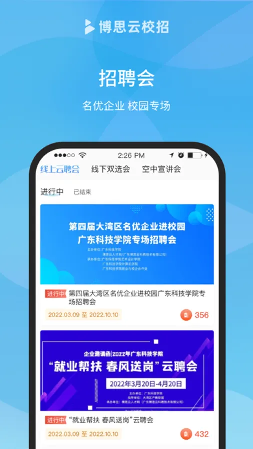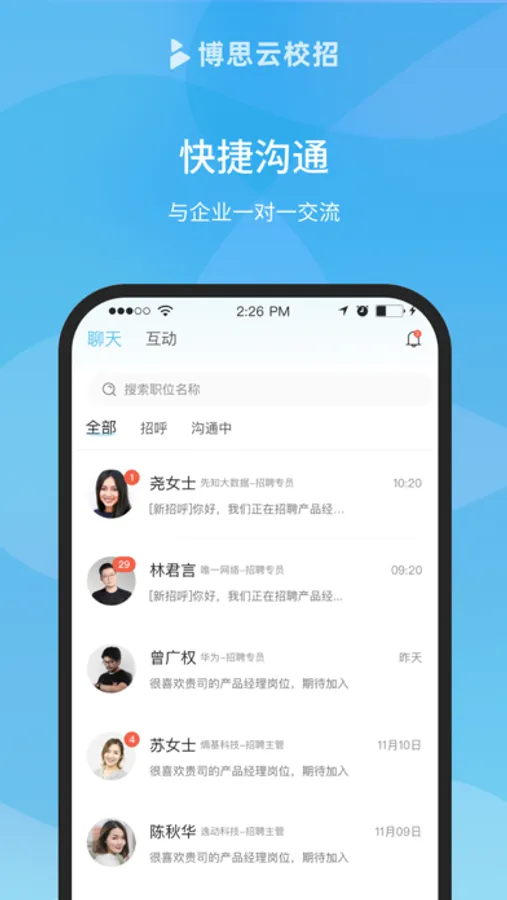 博思云校招让大学生就业更轻松、企业校招更高效。简历一键投递,在线一对一沟通,拥有真实准确的职位信息库,为大学生提供海量职位;上千所院校学生在此求职,企业快速匹配优秀人才。
