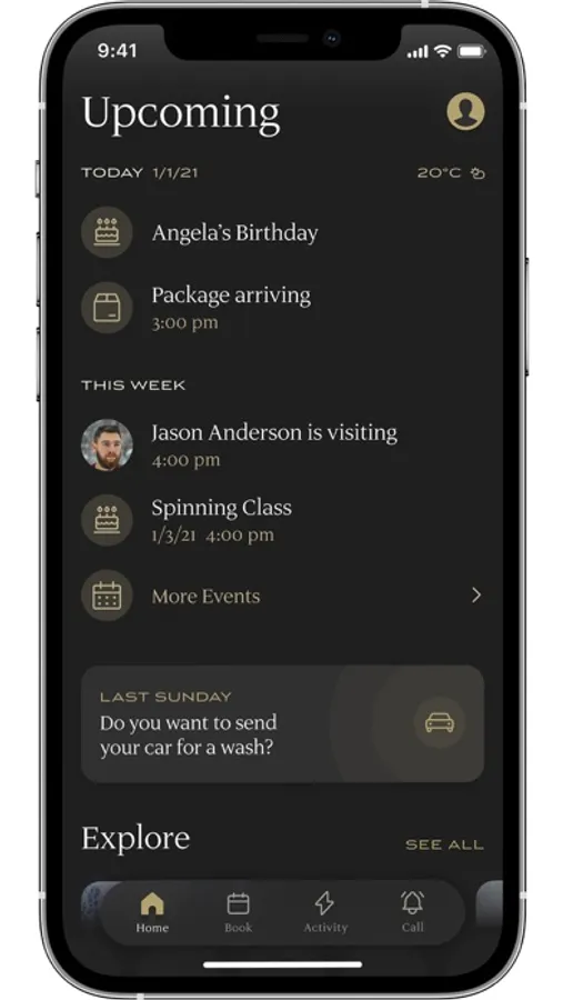 Events and Activities showcasing and bookings - Residents can book events with a curated list of in-house activities, special promotions, or nearby events and invite fellow residents and tenants, who’ll receive a notification with the option to add it to their calendar.