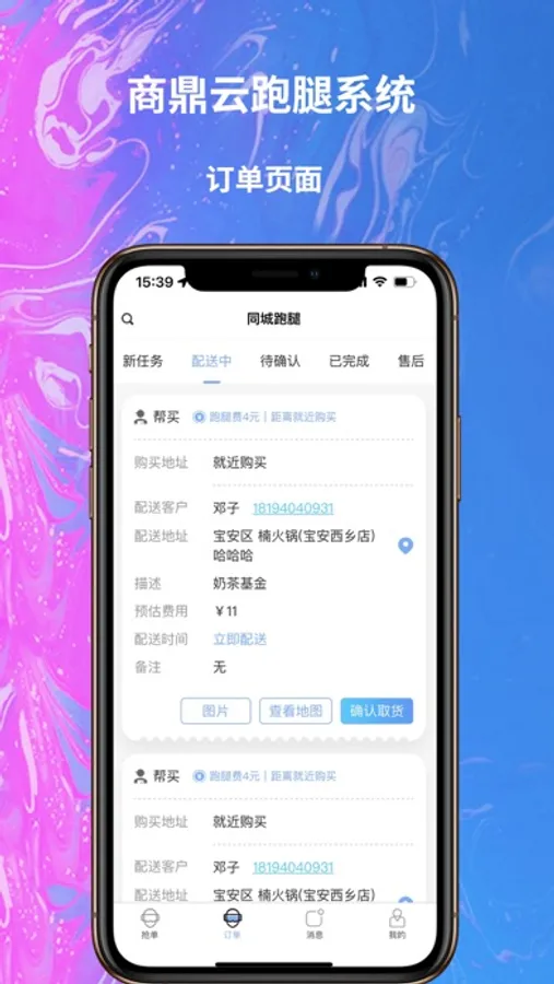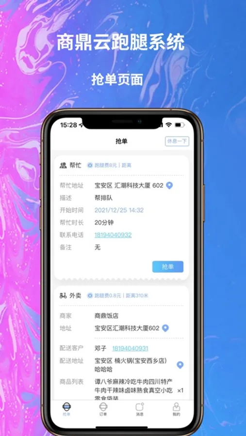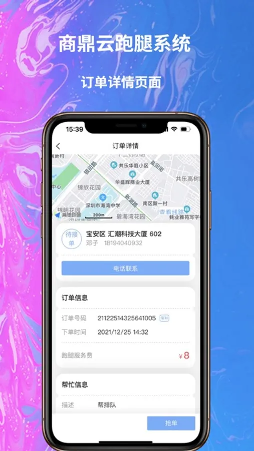 抢单页面展示附近几公里内的所有跑腿订单,且可看到订单的配送距离及佣金,方便跑腿人员根据自己实际情况接到优质订单。