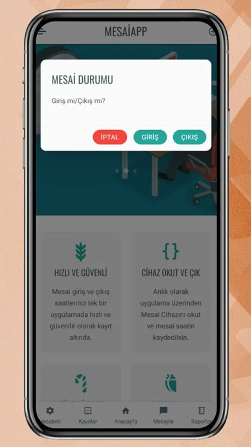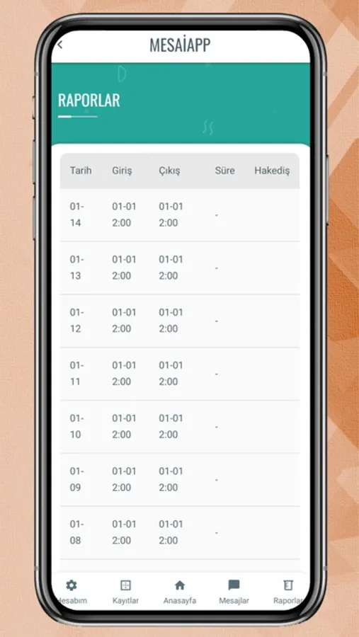 Kullanıcıların çalışma mesai giriş çıkış saatlerinin uygulama üzerinden takibini sağlar. Firma personellerinin belirlenen mesai ve çalışma süreçlerini takip etmeyi sağlayan yönetim yazılımıdır. Sistem ile tüm personeller kendi mesai saatlerini sistem üzerinde anlık olarak takip edebilir ve kontrol noktalarından geçiş tarih ve saatleri rapor olarak alınabilir.