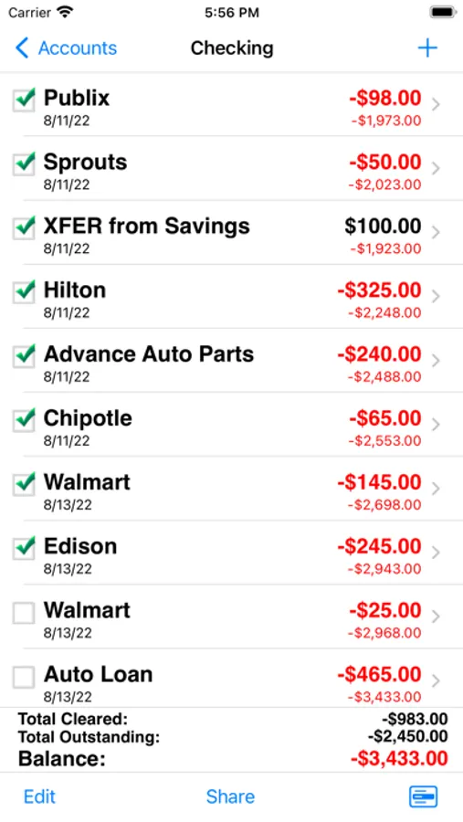 As you type, a list will show you your previously entered descriptions and corresponding category. Selecting an entry from the list will fill both fields of the transaction.