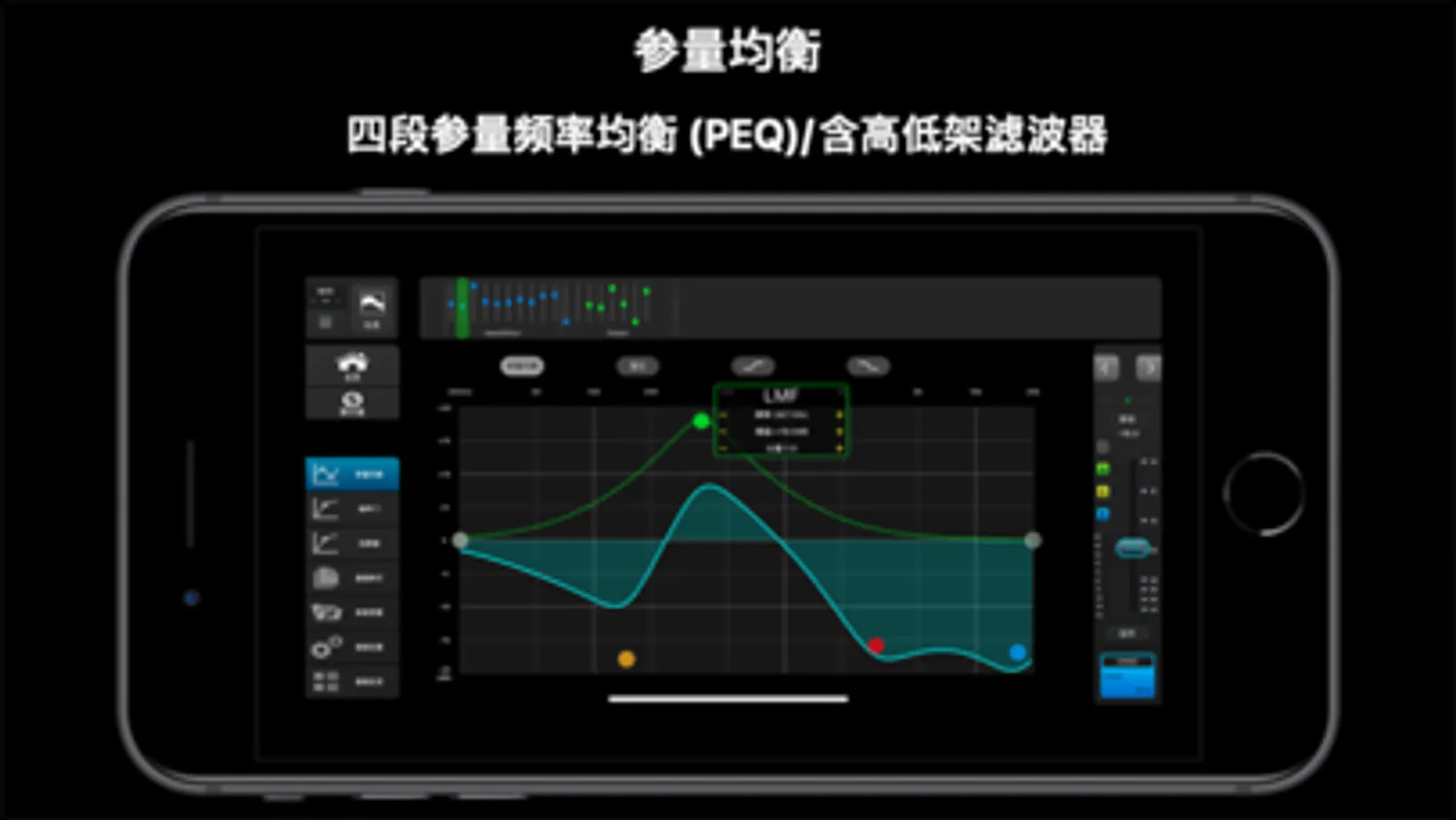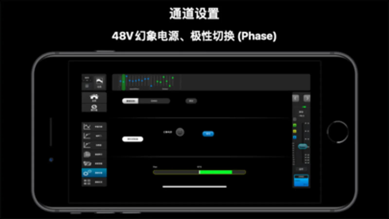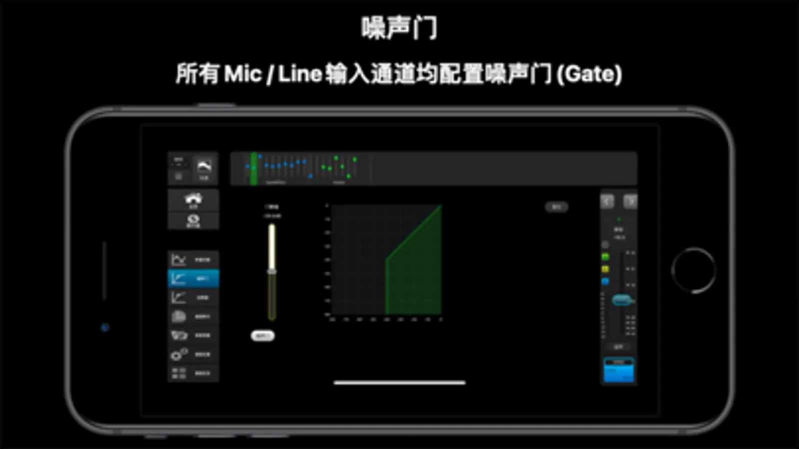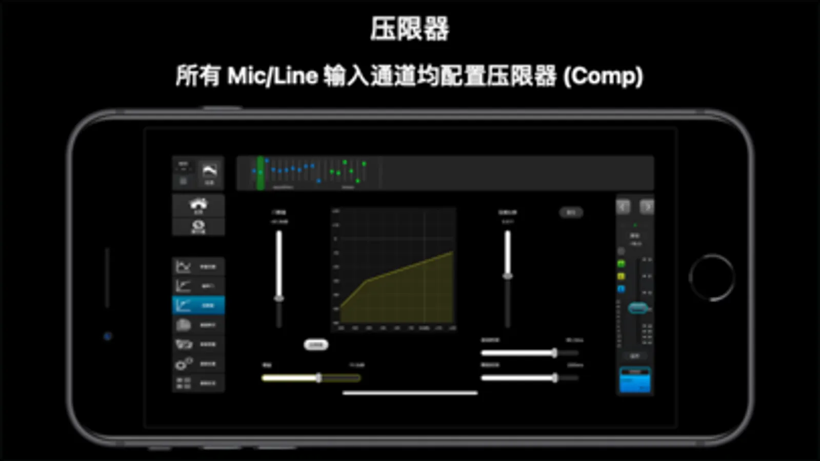- 所有Mic / Line输入通道均配置:48V幻象电源、极性切换(Phase)、噪声门(Gate)、压限器(Comp)、四段参量频率均衡(PEQ) /含高低架滤波器。