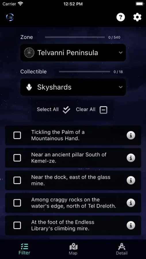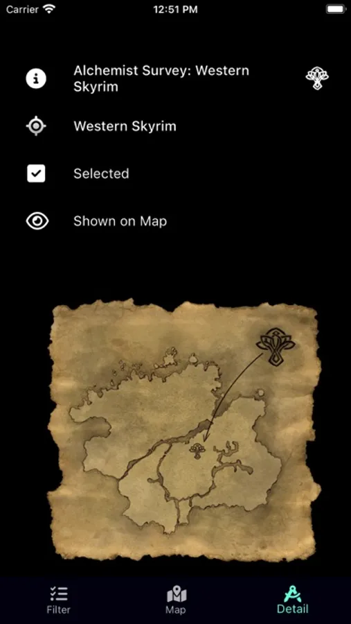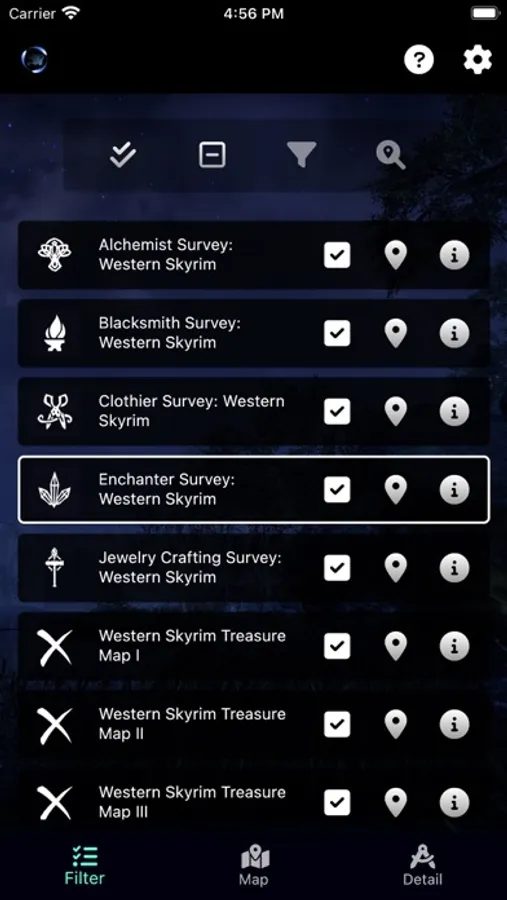 Items can be located on their respective zone maps and ticked off as they are completed. Treasure map and survey detail can be viewed for each item as you hunt to save you time opening and closing your inventory. You can also find missing Mages Guild books and Skyshards while completing surveys.