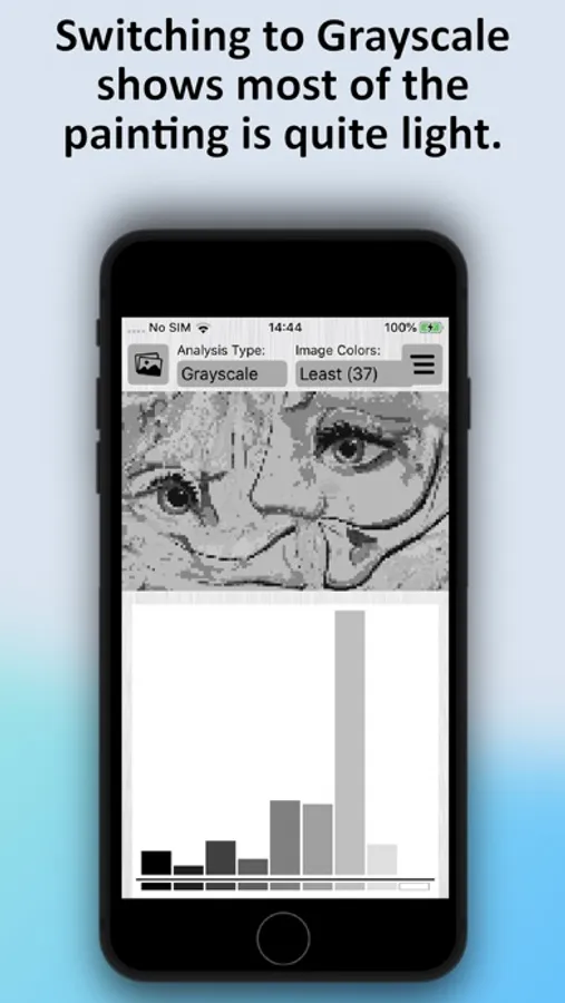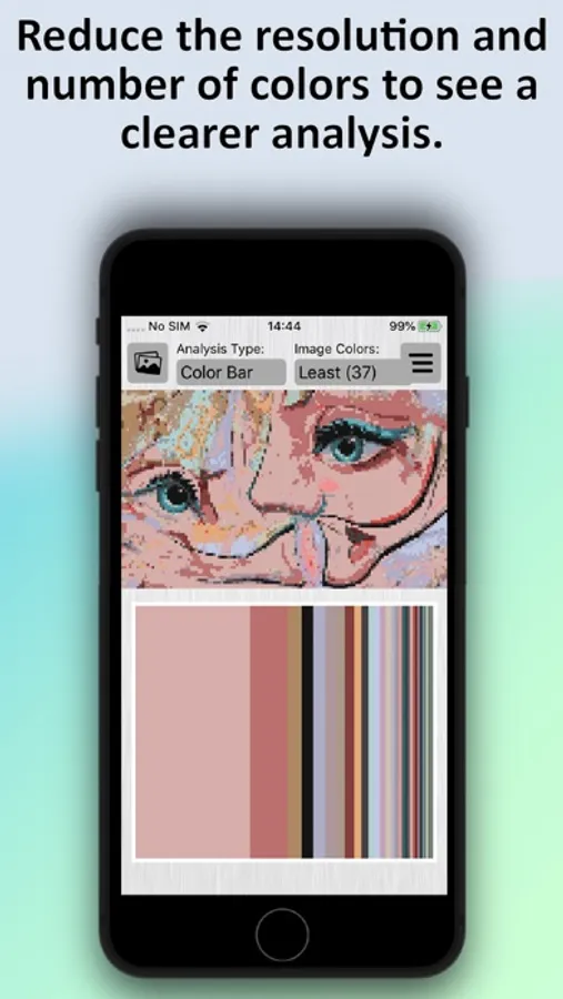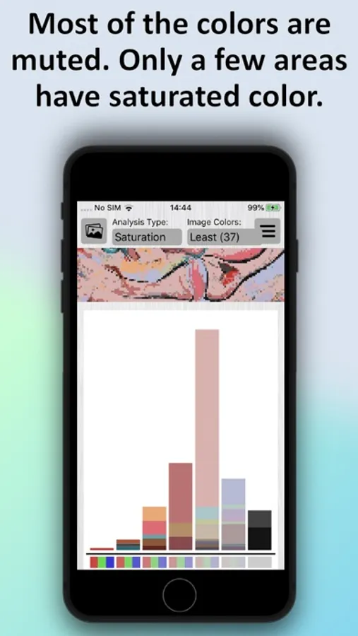 The app takes an image and groups the colors at three different levels of groupings, so you can choose between “most”, “middle” and “least” amount of colors to suit your image. Each level can be analyzed in any of ten ways.