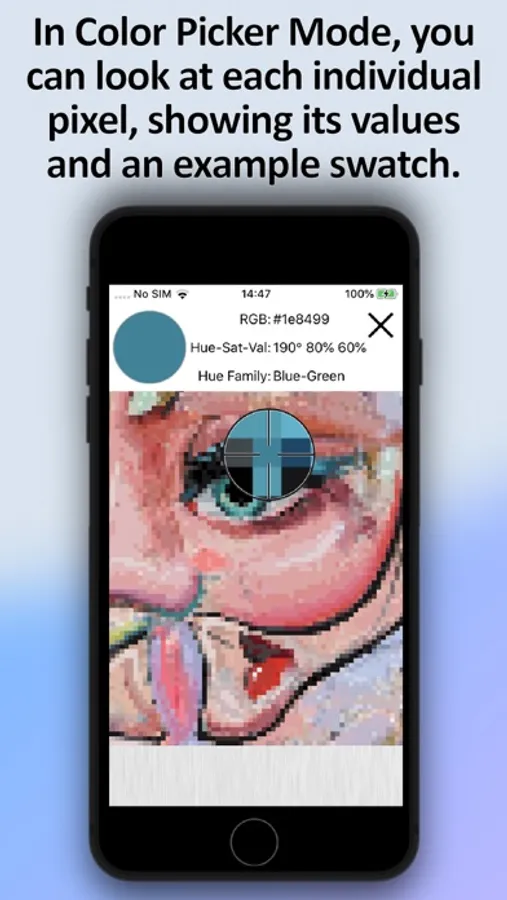 In Color Picker mode, you can look at individual pixels for its RGB (red, green, blue), HSV (hue, saturation, value) and color-family. RGB and HSV are used in computer graphics programs to describe a color. Color Picker mode gives you a color disk that you can use to mix your paint to when trying to color match your reference.